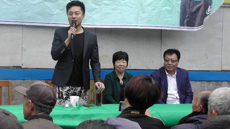 获奖果农与幸运飞艇168体彩开奖官网董事长颜桂荣、山东卫视著名节目主持人芝麻一起合影留念。